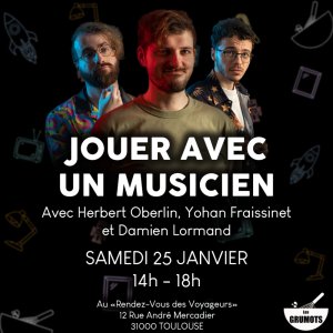 2025-01-25 14:00:00 2025-01-25 18:00:00 Europe/Paris Stage Grumots - Jouer avec un musicien Reservations on : https://www.billetweb.fr/stage-grumots-jouer-avec-un-musicien -- Improviser, c'est comme du jazz : chaque comédien.ne.x est comme un instrument qui joue ses notes en écoutant à la fois ses envies et son instinct, mais aussi en écoutant ses partenaires afin de créer une partition rythmée et harmonieuse.   Mais que se passe-t-il si cette métaphore va encore plus loin, et que les scènes sont accompagnées par une vraie musique, elle aussi improvisée ? Comment faisons-nous, sur scène, pour jouer en se laissant impacter par les propositions du musicien ? Comment lui laisser la place d'improviser et d'être force de proposition, au même titre que nous ? Comment créer un dialogue entre notre jeu et sa musique ? Le Rendez-vous des Voyageurs, Rue André Mercadier, Toulouse, France Les Grumots