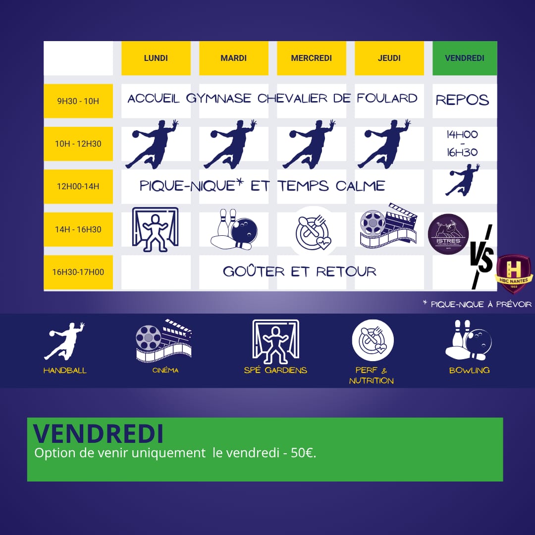 Vendredi de 14h à 16h30 + match Istres vs HBC Nantes