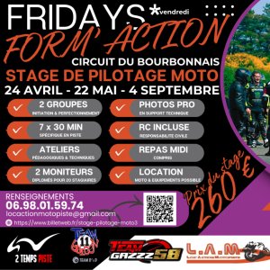 2026-04-24 08:30:00 2026-09-04 17:30:00 Europe/Paris stage pilotage moto Reservations on : https://www.billetweb.fr/stage-pilotage-moto3 -- STAGE PILOTAGE MOTO   -2 Groupes : initiation et perfectionnement -Ateliers pédagogiques et techniques ( 7 x 30 mn en piste privatisé)   --RC (assurance) incluse , repas de midi inclus. --Photographe pro sur l'ensemble de la journée. --Moto adaptée et équipement pilote piste obligatoire --Location de moto et/ ou équipement possible , infos au 06 98 01 59 74 Circuit Du Bourbonnais, Montbeugny, France power racing circuit du bourbonnais