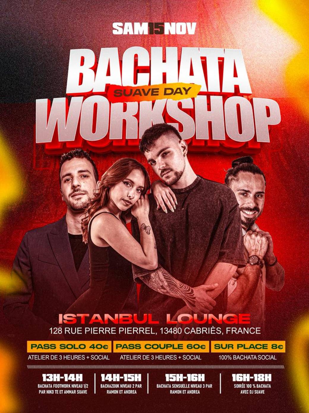 - 8€: Social 100% Bachata (on t'attend directement sur place)