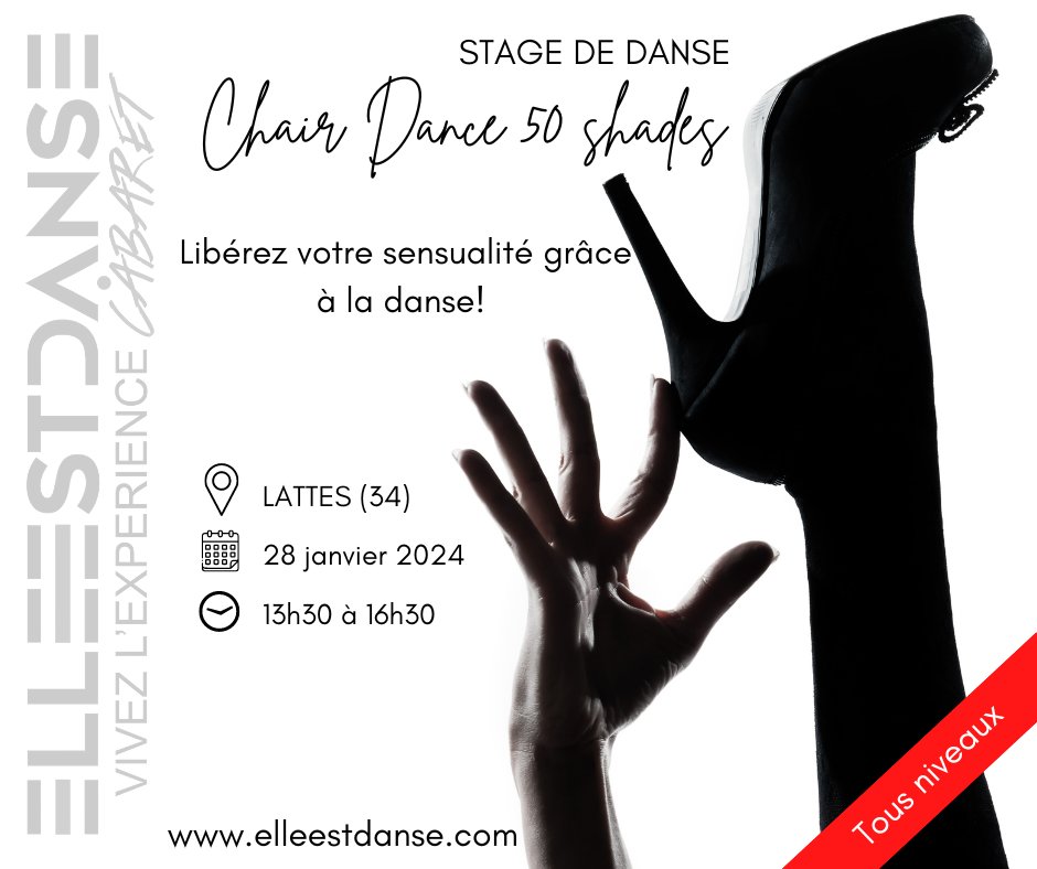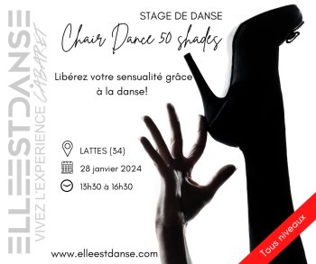 2024-01-28 13:30:00 2024-01-28 16:30:00 Europe/Paris Stage THÉMATIQUE "Chair Dance 50 shades" LATTES (34) Reservations on : https://www.billetweb.fr/stage-th-matique-chair-dance-50-shades-lattes-341 -- LATTES   INFOS Durée du stage: 3h  Periodicité: 1 fois Dates: 28 janvier 2024 Horaires: 13h30/16h30 Adresse: 777 av du méjean, LATTES Tous niveaux   DESCRIPTION C'est sur la bande son "i put a spell on you" du film Fifty shades of Grey que vous revelerez votre sensualité durant ce stage de 3h. L'accessoire de la chaise vous facilitera l'expression de cette partie de vous-meme que vous n'osez peut etre pas encore accepter.   En quelques mots un stage: sensuel, sexy, slow, feminin, bienveillance, depassement de soi    A QUI S'ADRESSE CE STAGE? Ce stage s'adresse à dans amatrices passionnées de danse ou des femmes qui souhaitent tout simplement découvrir un nouvel univers.      TARIF: 49€   Billets non échangeables et non remboursables sous aucune condition   Nous contacter pour: Paiement par CHEQUES VACANCES   777 Avenue du Méjean, Lattes, France Audrey Bassé