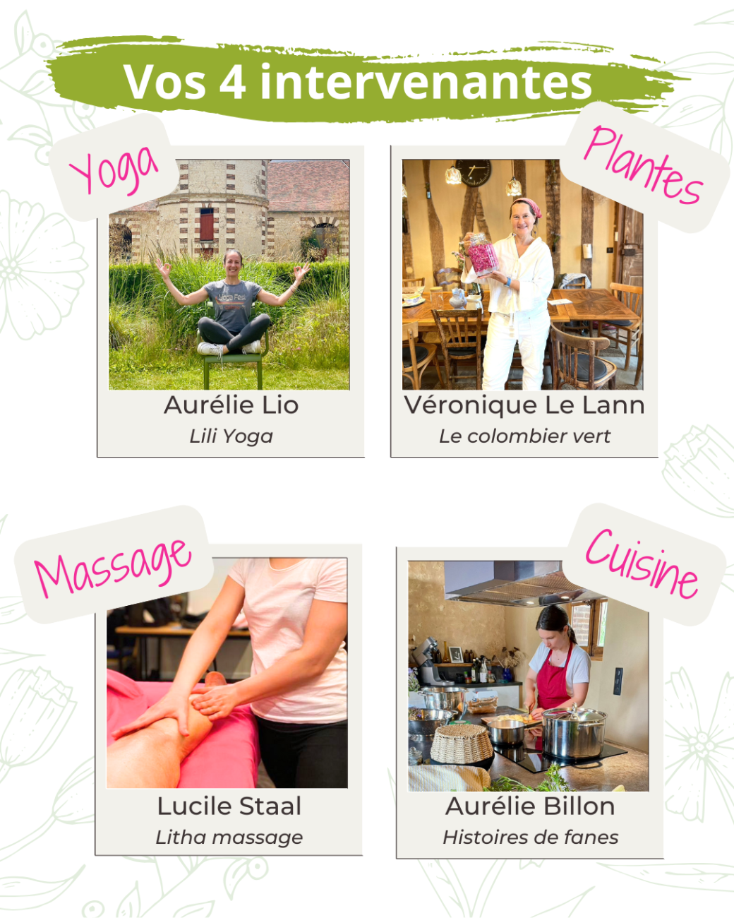 - Aurélie, à l'initiative du stage, professeure certifiée, pour des pratiques variées de yoga, doux ou dynamique suivant les moments de la journée