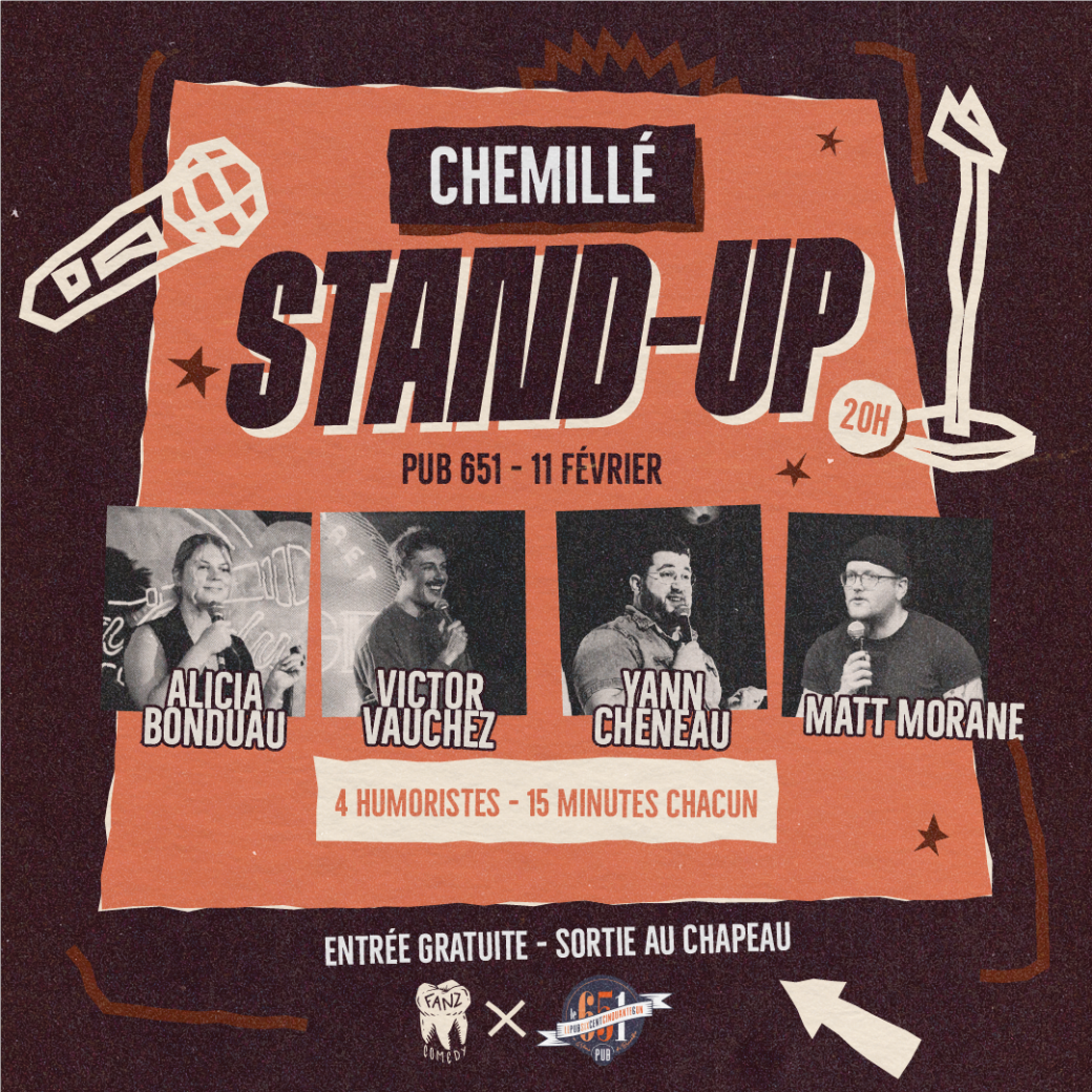 Le Pub 651 de Chemillé-en-Anjou se transforme pour la seconde fois en Comedy Club le temps d’une soirée, pour plus d’une heure de rires, en compagnie de 4 Humoristes !