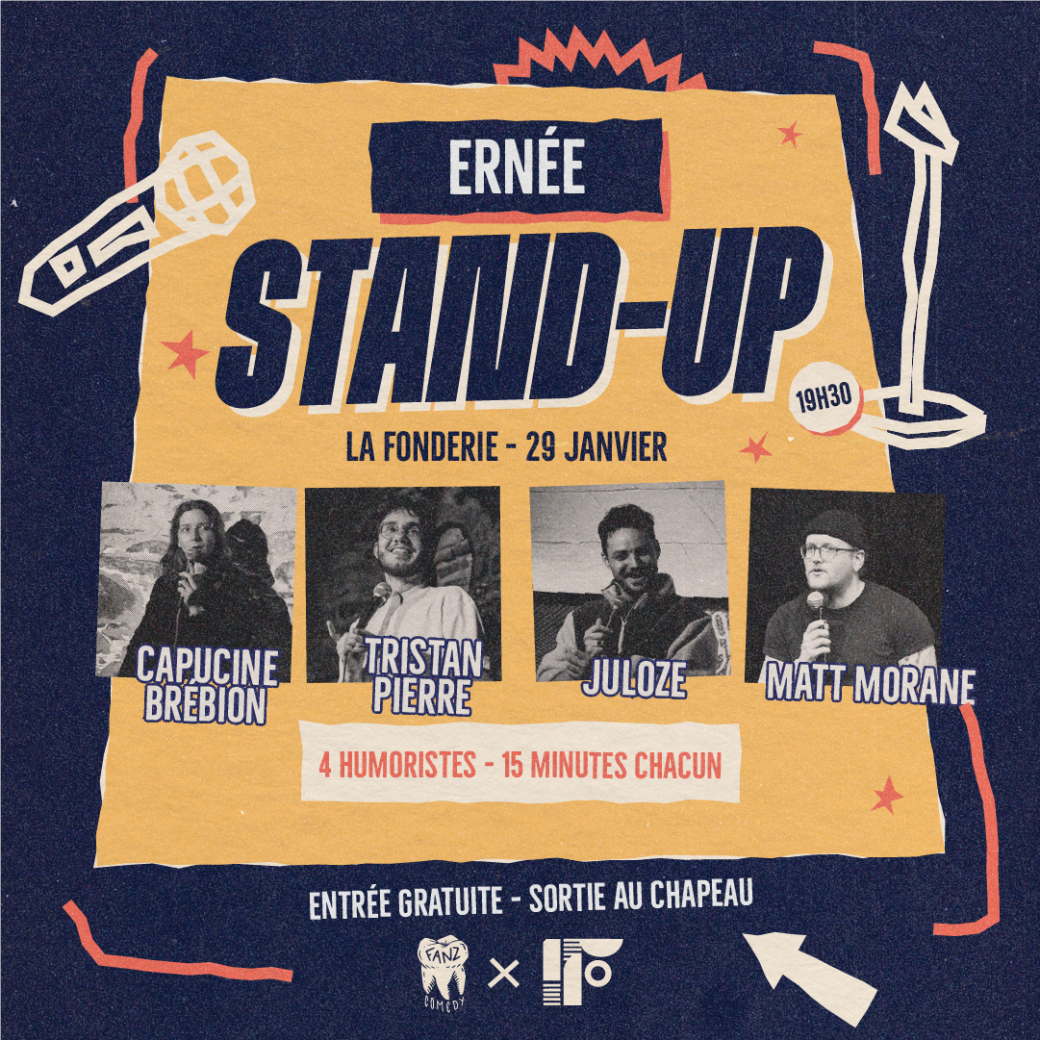 La Fonderie de Ernée se transforme pour la première fois en Comedy Club le temps d’une soirée, pour plus d’une heure de rires, en compagnie de 4 Humoristes !