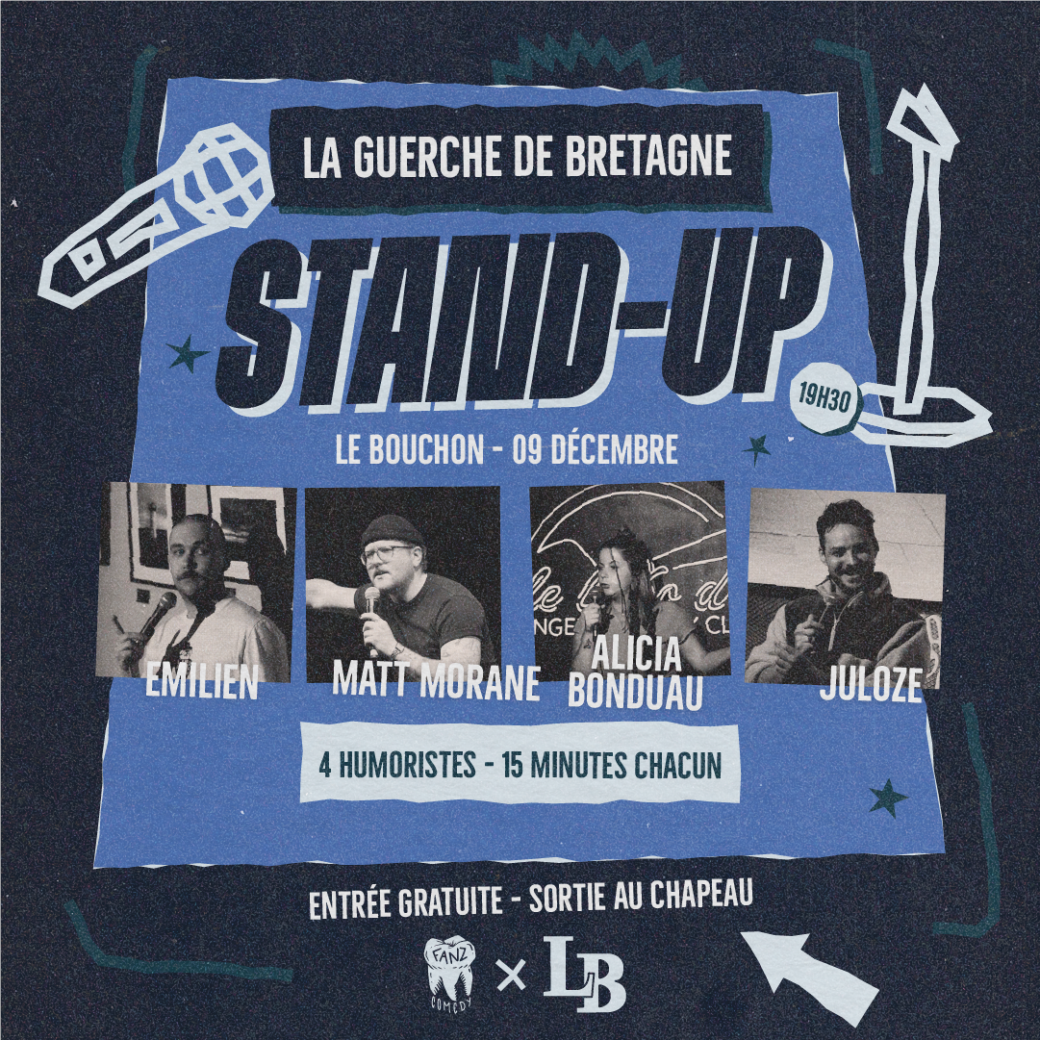 Le Bouchon de Guerche de Bretagne se transforme pour la première fois en Comedy Club le temps d’une soirée, pour plus d’une heure de rires, en compagnie de 4 Humoristes !