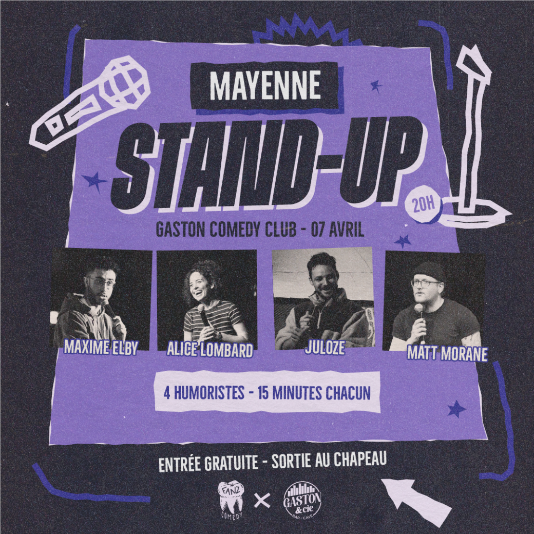 Le Gaston & Cie de Mayenne se transforme une nouvelle fois en Comedy Club le temps d’une soirée, pour plus d’une heure de rires, en compagnie de 4 Humoristes !