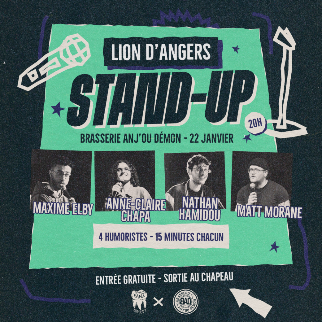 La brasserie Anj'ou Démon du Lion d'Angers se transforme pour la première fois en Comedy Club le temps d’une soirée, pour plus d’une heure de rires, en compagnie de 4 Humoristes !