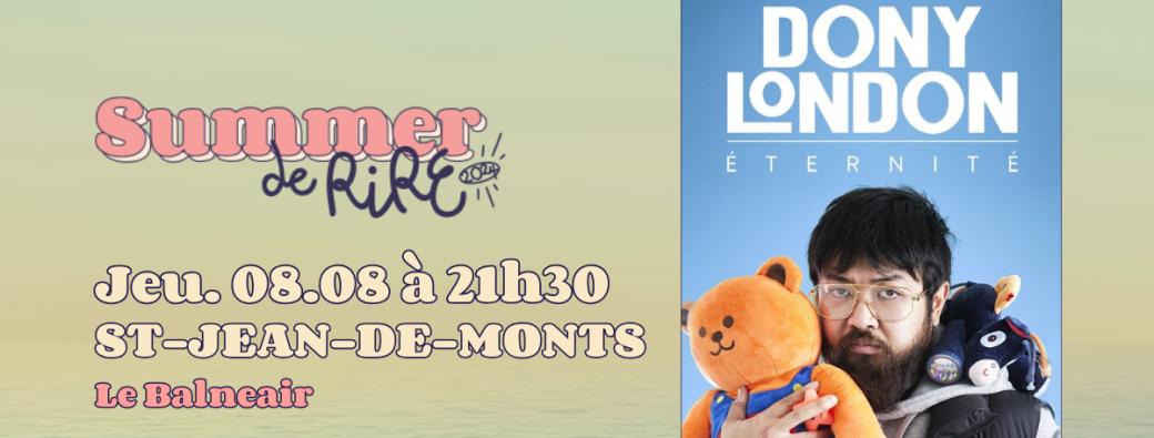 2024-08-08 21:30:00 2024-08-08 23:00:00 Europe/Paris SUMMER DE RIRE @ Saint-Jean-De-Monts : Spectacle Dony London "Éternité" (stand-up) Reservations on : https://www.billetweb.fr/summer-de-rire-saint-jean-de-monts-spectacle-dony-london-eternite -- DONY LONDON - "Éternité" Jeudi 8 Août 2024 à 21h30 https://www.instagram.com/donylondon/ https://www.tiktok.com/@donylondon Originaire de Bordeaux, Dony London trouve sa route dans l'humour grâce à sa pertinence et sa facilité d'écriture développée par la musique. Son humour grotesque, son regard, son autodérision et ses questionnements sur ce qui l'entoure donnent à réfléchir autant qu'à rire. Pertinent, il bouleverse les codes, fort d'un humour naturel ayant la réalité d'une vie bien remplie.   Particulièrement apprécié sur les plateaux du Carton Comedy Club, organisateur du festival Summer de Rire, le stand-up de Dony London fait mouche à chaque punchline, s'appuyant sur un sens du timing sûrement acquis durant ses années rap étant plus jeune. Autodidacte de génie, il distille anecdotes gênantes de couple et de père de famille et blagues imparables pour créer un moment unique de rire en connivence avec un public toujours ravi. Son spectacle "Éternité", fruit de 3 années de travail… BALNEAIR, Esplanade de la Mer, Saint-Jean-de-Monts, France Carton PROD (Festival Summer de Rire)