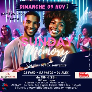 2025-11-09 15:00:002025-11-09 23:00:00America/GuadeloupeSUNDAY MEMORYReservations on : https://www.billetweb.fr/sunday-memory7