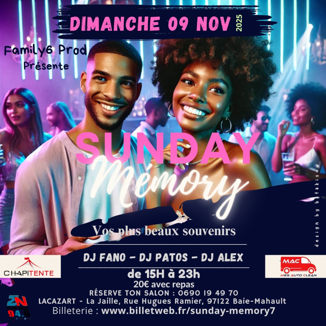 L'équipe du SUNDAY Mémory vous invite à revivre des moments gravés dans vos mémoires ! Soirée Fèy a koko, soirée "Tan", soirée mousseux, soirée hommes boissons/Femmes pâtisseries... ça vous parle !