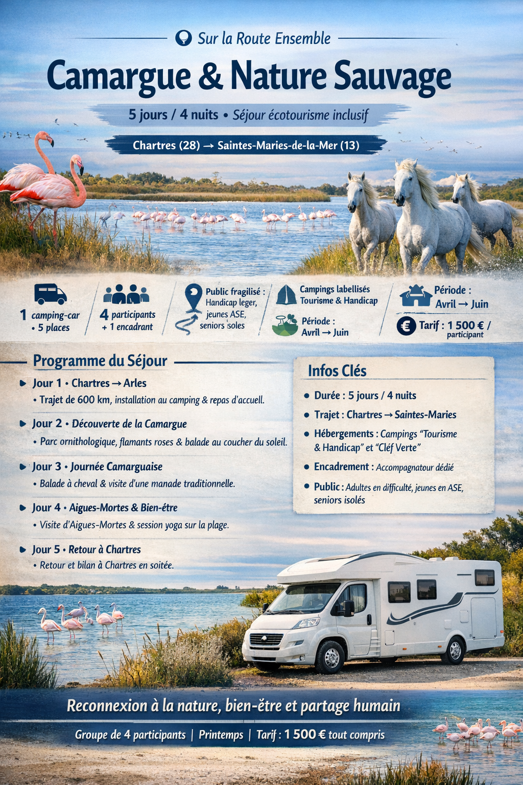 Sur la Route Ensemble propose des séjours itinérants en camping-car, accessibles à tous, favorisant l’inclusion, la réinsertion et le lien social.