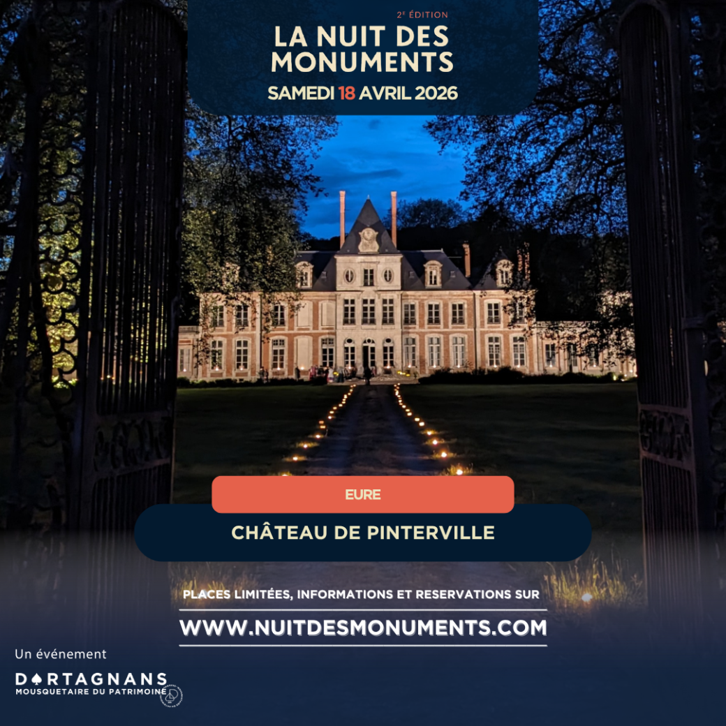 Situé dans la vallée de l’Eure, le château de Pinterville fut construit au XVIIe siècle par Pierre Le Pesant de Boisguilbert, pionnier de la pensée économique moderne. Agrandi au XVIIIe siècle par son petit-fils, le monument s’ouvre alors sur une cour d’honneur accessible par une allée bordée de majestueux platanes, et fermée par une grille monumentale. Côté jardins, un parc à l’anglaise, structuré par des arbres remarquables descend jusqu'à la rivière.