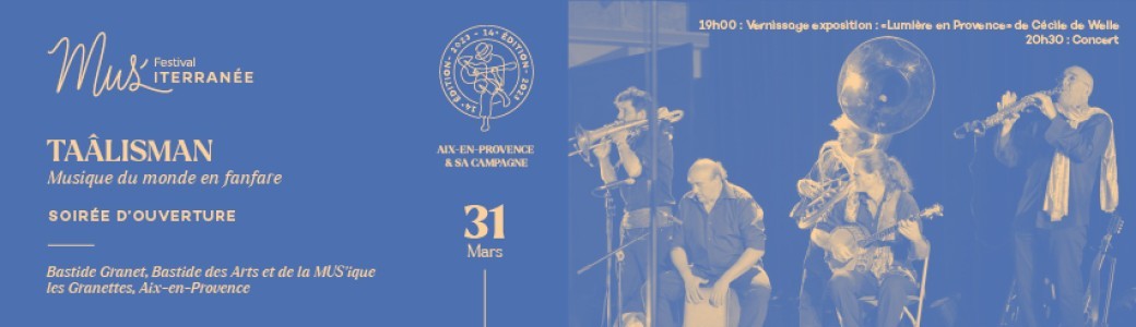 2023-03-31 19:00:00 2023-03-31 21:30:00 Europe/Paris Taâlisman (+vernissage) Reservations on : https://www.billetweb.fr/taalisman-vernissage -- 210 Chemin de Granet, Aix-en-Provence, France Festival MUS'iterranée