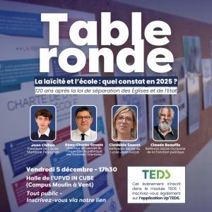 2025-12-05 17:30:002025-12-05 19:00:00Europe/ParisTable ronde - "La laïcité et l’école en 2025 : quel constat ?" - 05/12 (17h30)Reservations on : https://www.billetweb.fr/table-ronde-la-laicite-et-l-ecole-en-2025-quel-constat
