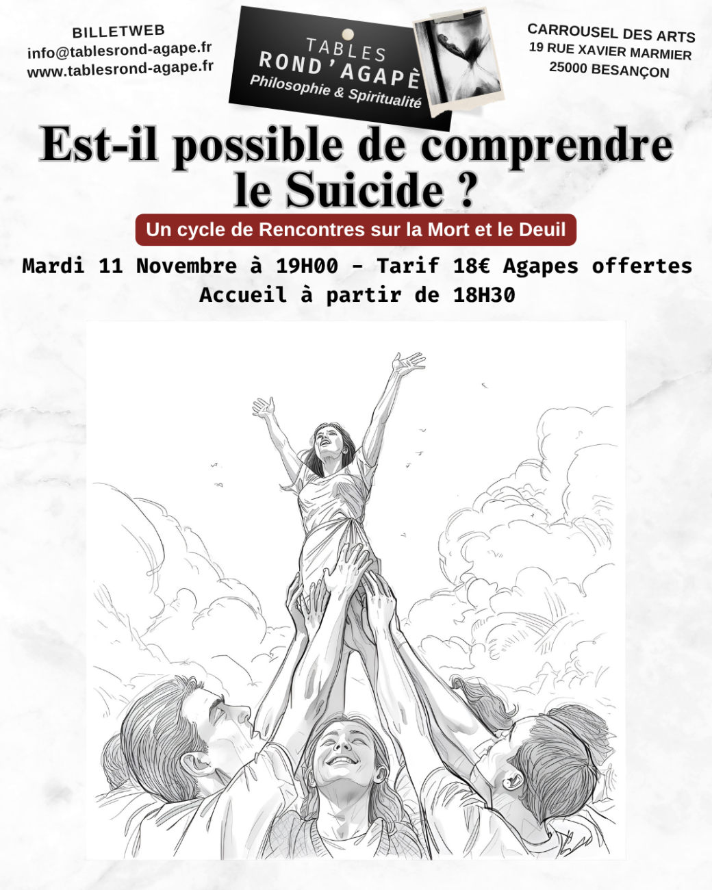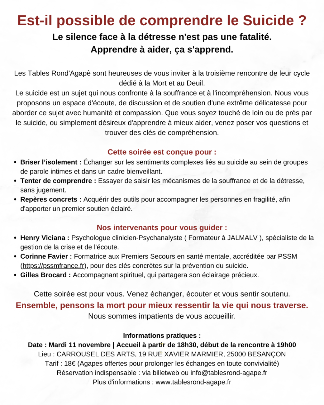 Que vous soyez touché de loin ou de près par le suicide, ou simplement désireux d'apprendre à mieux aider, venez poser vos questions et trouver des clés de compréhension.