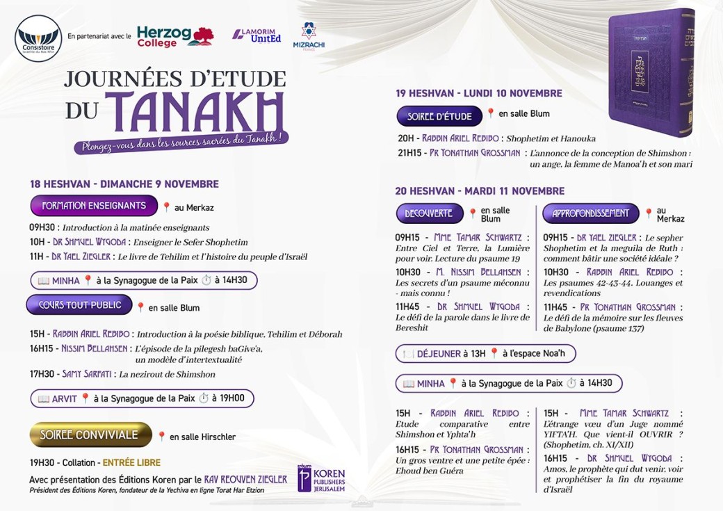 Sous le haut patronage du Grand Rabbin Avraham Harold Weill et du Consistoire du Bas-Rhin et à l’initiative du rabbin Ariel Rebibo et de Nissim Bellahsen, les Journées de découverte et d’étude du Tanakh sont l’occasion de plonger dans ces livres fondateurs de la foi et de l’identité juive et de les étudier pour eux-mêmes, avec des spécialistes du sujet venus d’Israël, de Paris et de Strasbourg. Ces journées de découvertes et d’étude de la Bible auront lieu du 9 au 11 novembre 2025, à Strasbourg.