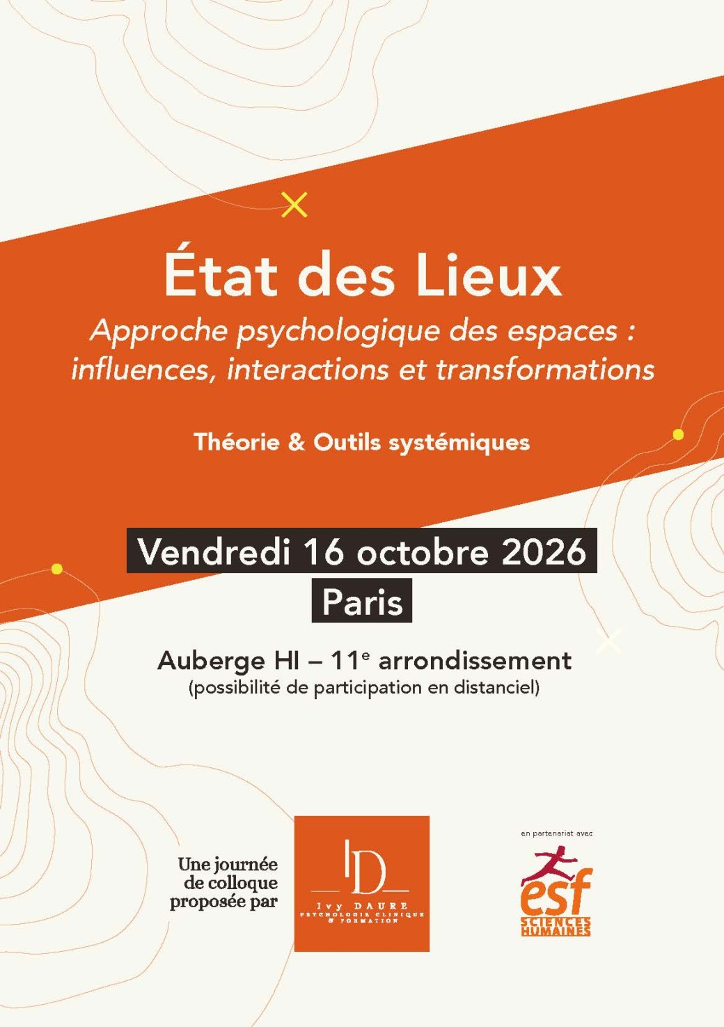 2026-10-16 08:30:002026-10-16 18:00:00Europe/ParisÉtat des Lieux - Approche psychologique des espaces : influences, interactions et transformationsReservations on : https://www.billetweb.fr/tat-des-lieux-approche-psychologique-des-espaces-influences-interactions-et-transformations