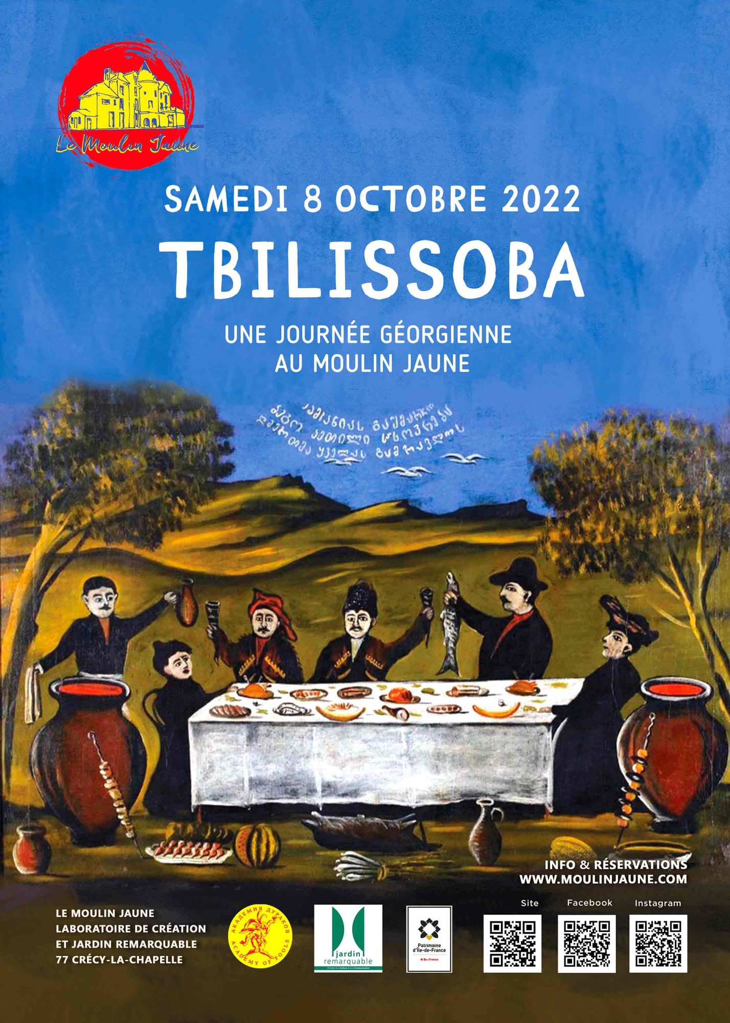 Dress code : Pour s'immerger et profiter pleinement du laboratoire de création qu'est le Moulin Jaune, il est recommandé aux visiteurs de revêtir une tenue ou un accessoire en accord avec la thématique du jour : La Géorgie : tenues rouges et bordeaux, toques et moustaches (réelle, factice ou maquillée).