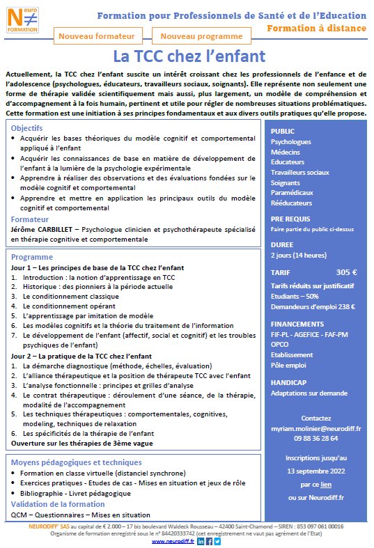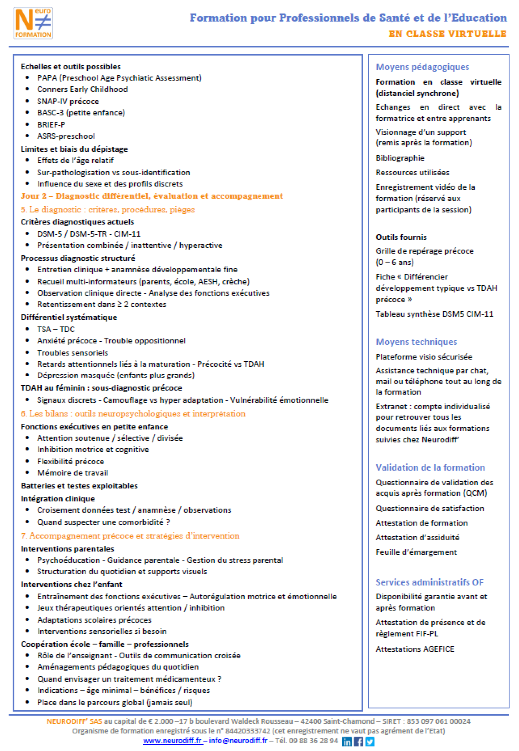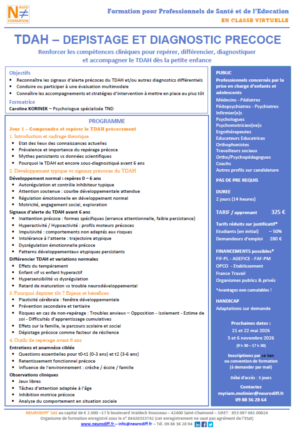 2026-05-21 09:30:002026-11-06 17:30:00Europe/ParisTDAH - Dépistage et diagnostic précoceReservations on : http://neurodiff.fr