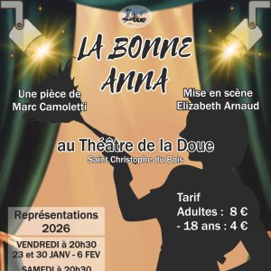 2026-01-23 20:30:00 2026-02-08 15:00:00 Europe/Paris La bonne Anna Reservations on : https://www.billetweb.fr/tdld-2026-la-bonne-anna -- 1 Rue de la Libération, 49280 Saint-Christophe-du-Bois Théâtre de la Doue
