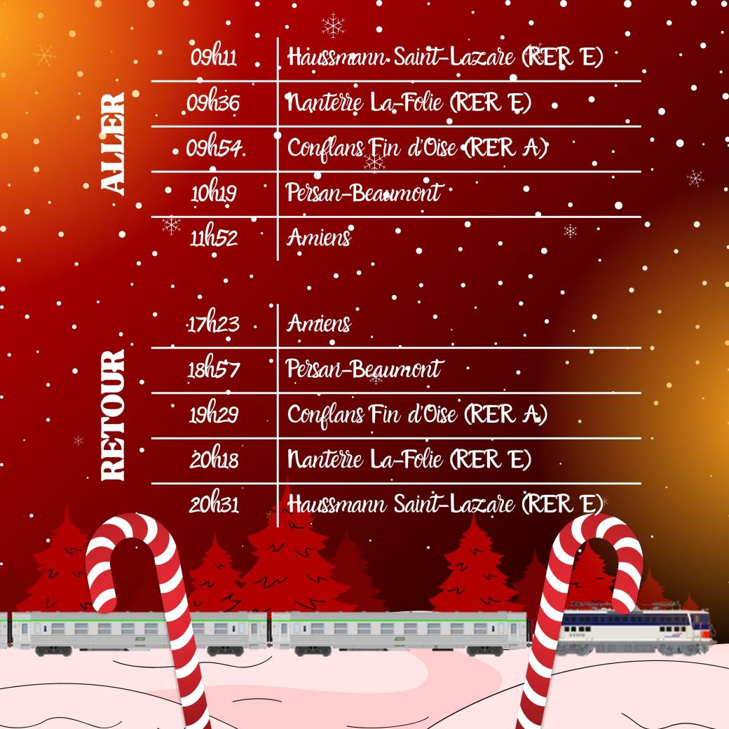 Embarquez à bord du Train de Noël pour une escapade magique direction Amiens. Depuis Paris Haussmann Saint-Lazare (RER E), Nanterre-La Folie (RER E), Conflans Fin d'Oise (RER A) et Persan Beaumont, vivez un voyage inédit à bord d’un train historique et laissez-vous transporter vers la féerie du plus grand marché de Noël du Nord de la France. Une expérience unique, chaleureuse et hors du temps vous attend.