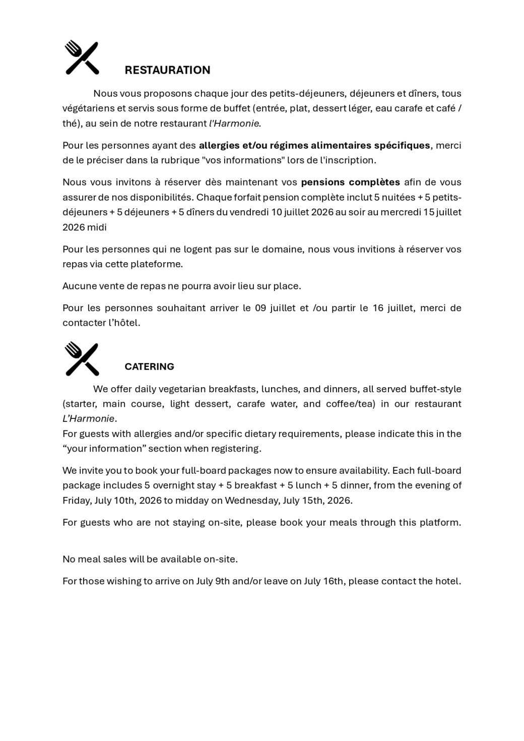 Afin d'organiser au mieux votre séjour,nous vous remercions de réserver vos hébergements et repas via cette plateforme.