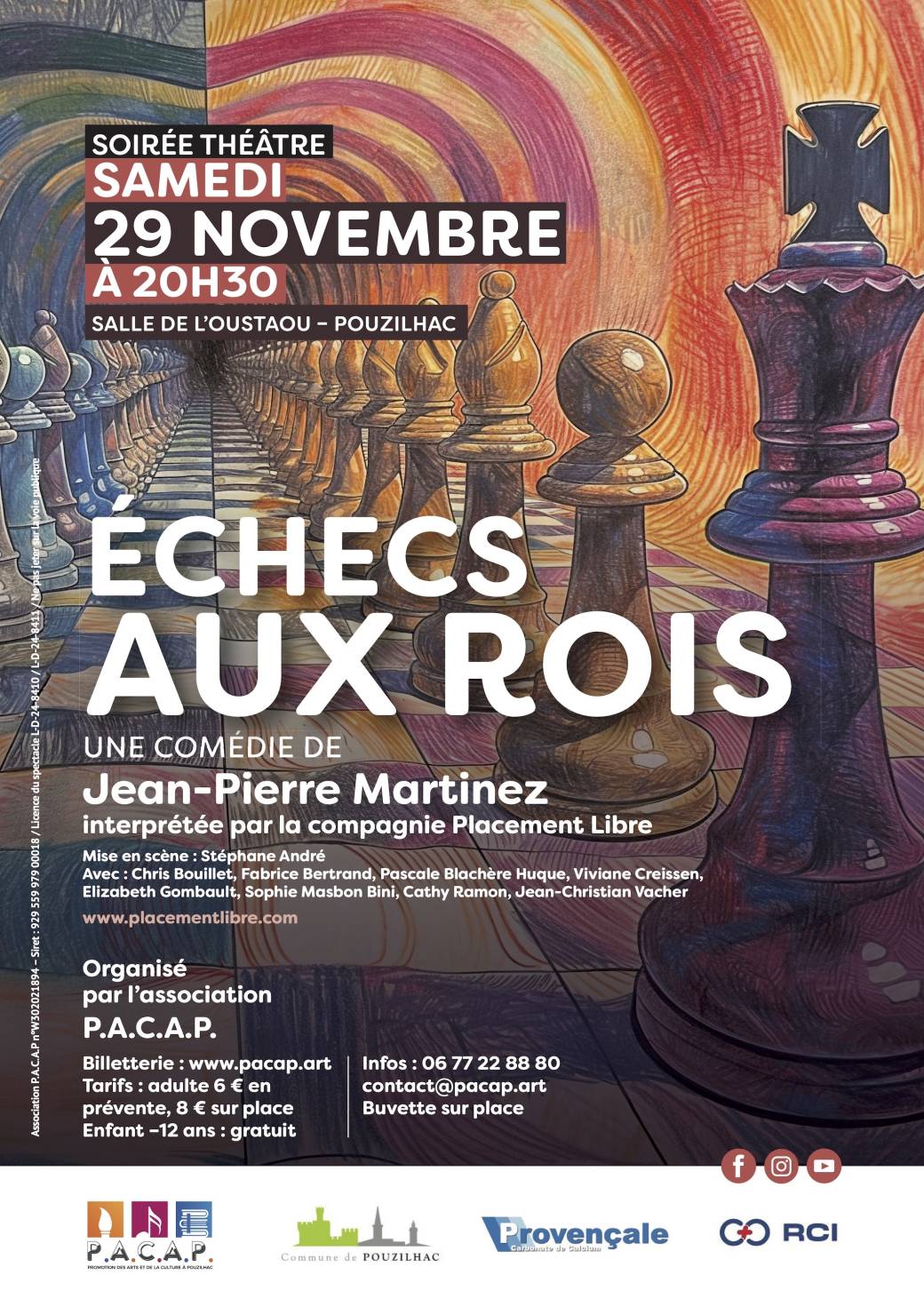 La politique, comme une partie d’échecs, se joue sans foi ni loi, où la morale s’efface devant la quête du pouvoir. Que l’on soit blanc ounoir, l’enjeu est clair : anéantir l’adversaire pour qu’il ne reste qu’un roi. Mais cette victoire,souvent illusoire, est une danse sur le fil de l’absurde, car la défaite de l’autre signifie également la fin de la partie. L’avenir n’est alors que la promesse d’une revanche à venir.Dans cette comédie grinçante, les personnages roi, reine et ceux qui rêvent de prendre leur place n’hésitent pas à sacrifier les pions sur l’échiquier de la vie pour obtenir une victoire éphémère.Chaque coup est un stratagème,chaque sourire un masque, et la scène devient le théâtre d’un affrontement où les extravagances politiques prennent des tournures à la fois tragiques et comiques. Échecs aux rois illustre avec brio les dérives du pouvoir, les manigances et les illusions qui en découlent, mettant en lumière les absurdités de ceux qui succombent au virus de la politique. Préparez-vous à une réflexion incisive et à des rires inévitables dans cette satire mordante où chaque personnage joue sa propre partie, avec des enjeux que seul un roi pourrait comprendre