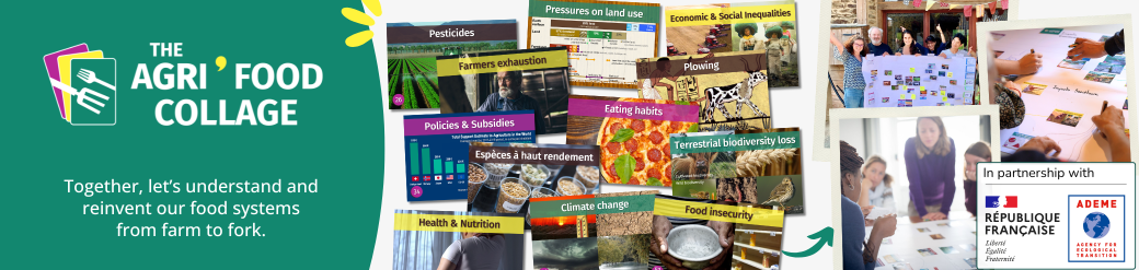 Developed in partnership with ADEME – the French agency for the ecological transition, The Agri'Food Collage is based on over 150 reference documents and the contribution of experts from the many fields related to our food: environment, economy, society, ... and a bit of history too! See it as the agri-food system "serious game", based on collective intelligence and extremely educational because it allows you to learn a lot in a very short time, whether you're just curious or already knowledgeable.