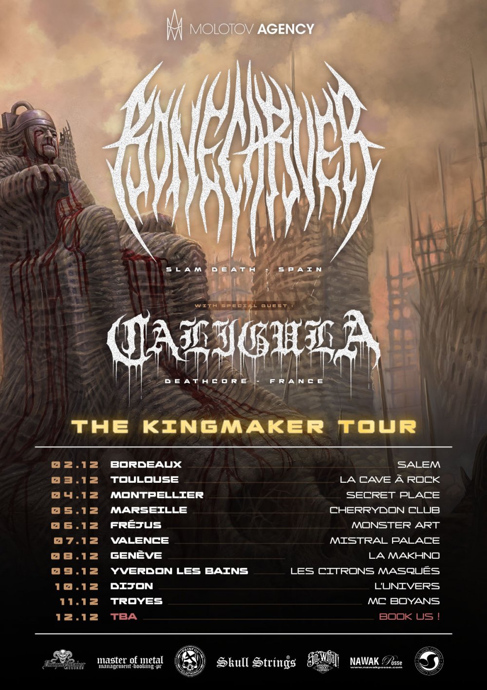 Dans le cadre de leur tournée européenne, "THE KINGMAKER TOUR", qui aura lieu du 02 au 12 Décembre, rendez-vous le Mardi 07 Décembre au Mistral Palace pour retrouver BONECARVER (Slam Death - Madrid) et CALIGULA (Metal - Montpellier).