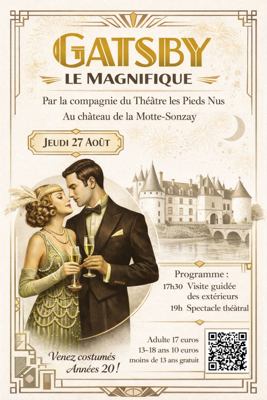 Cette adaptation théâtrale, portée par la compagnie Les Pieds Nus, vous transportera dans l’atmosphère envoûtante des années 1920, entre jazz, élégance et vertige des passions, pour une soirée de théâtre intense et inoubliable sous les étoiles.
