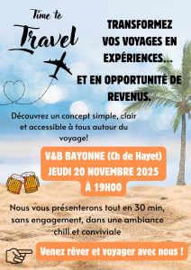 2025-11-20 18:00:002025-11-20 21:00:00Europe/ParisTime to Travel -Transformez vos voyages en expériences et en opportunité de revenusReservations on : https://www.billetweb.fr/time-to-travel-transformez-vos-voyages-en-experiences-et-en-opportunite-de-revenus