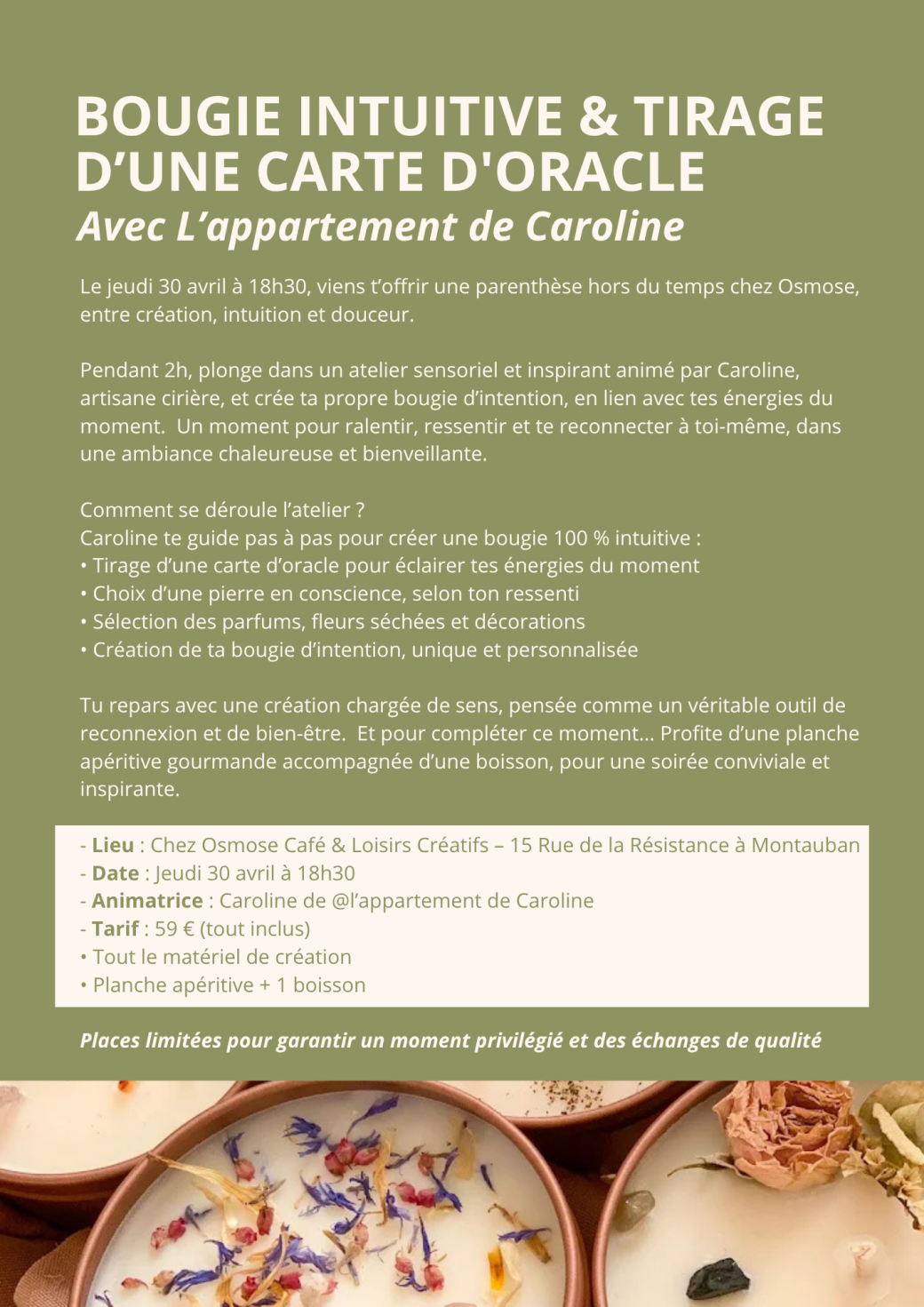 Tire ta carte d’oracle, explore son message et laisse-toi guider pour créer ta bougie d’intention personnalisée.