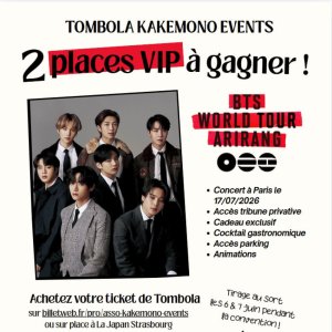 As part of its ‘La Japan’ convention on 6 and 7 June 2026 at the Parc des Expositions in Strasbourg (France), the Kakemono Events Strasbourg association is offering a raffle to win 1 shared VIP box ticket for the BTS concert at the Stade de France (worth €750 including tax!!)