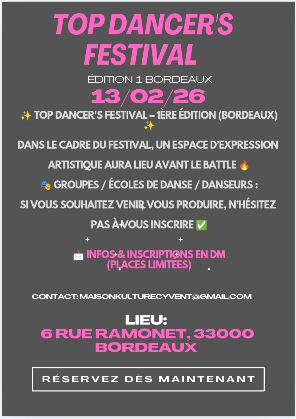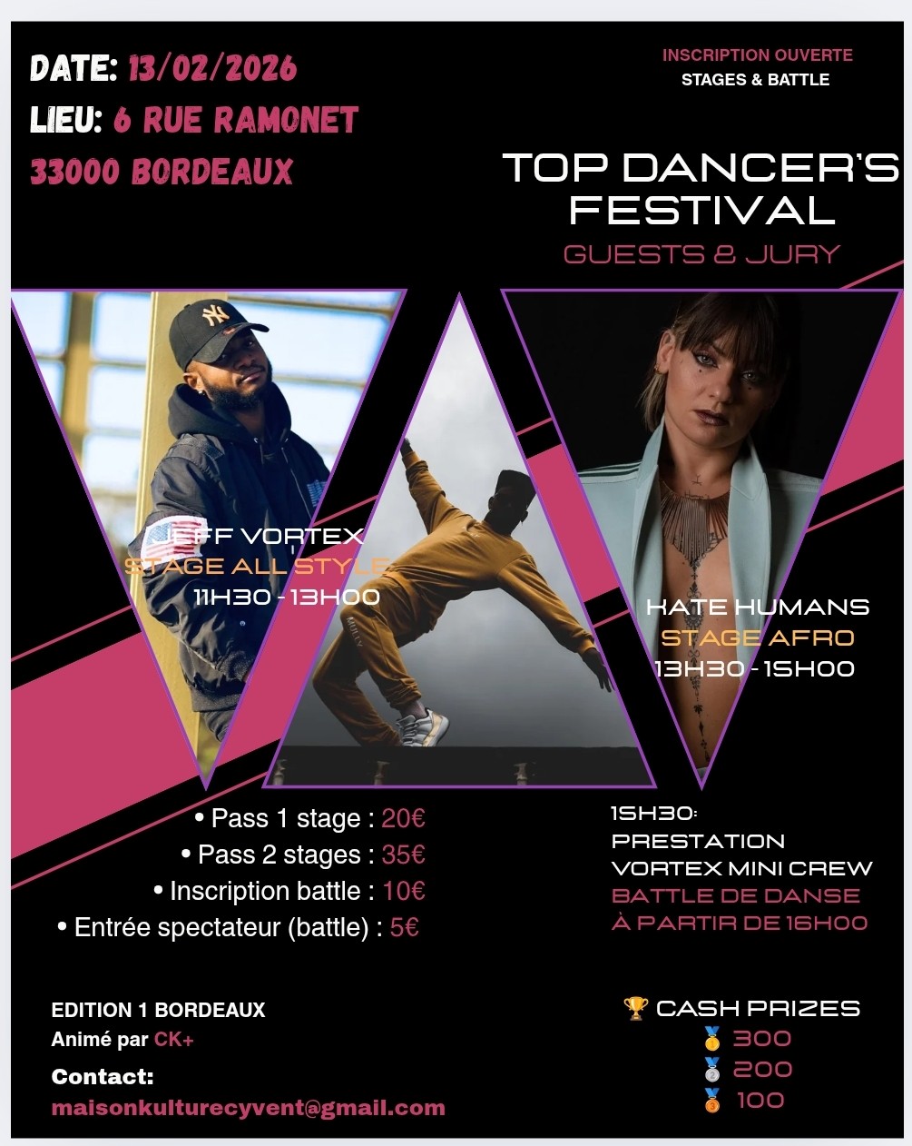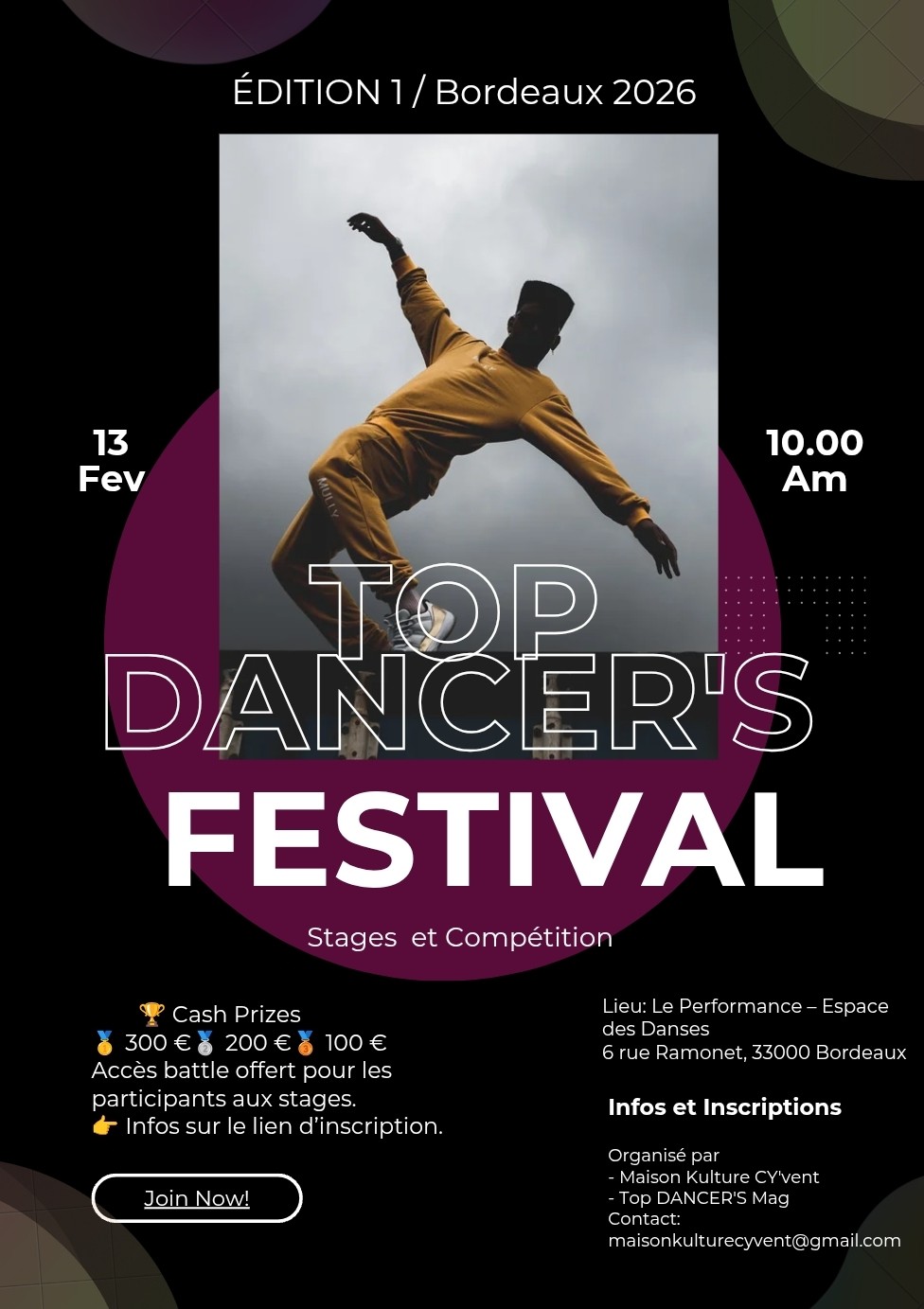 TOP DANCER'S FESTIVAL est un événement culturel et artistique dédié à la danse, réunissant passionnés, danseurs et curieux autour d’une journée de partage, d’apprentissage et de performance.