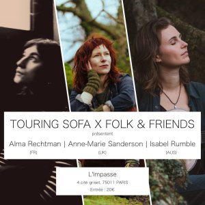 Organisée par Touring Sofa et Folk & Friends, cette rencontre inédite aura lieu à L'Impasse dans le 11ème, Paris.