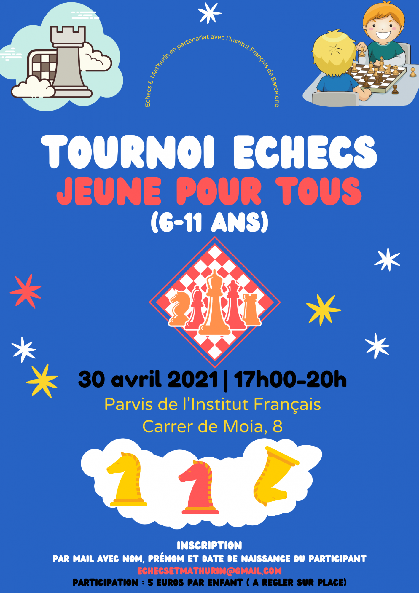 2021-04-30 17:00:00 2021-04-30 20:00:00 Europe/Paris Tournoi Enfant Echecs | 30 04 21 | Institut Français Reservations on : https://www.billetweb.fr/tournoi-enfant-echecs-30-04-21-institut-francais -- ​​​​​​​ Institut français - Barcelona, Carrer de Moià, Barcelone, Espagne Club Echecs & Mat'hurin