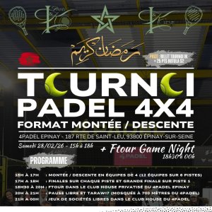 Suivi d'un buffet ftour dans le club house privatisé du 4Padel Epinay avant d'enchaîner sur une soirée jeux de sociétés jusqu'à 00h.