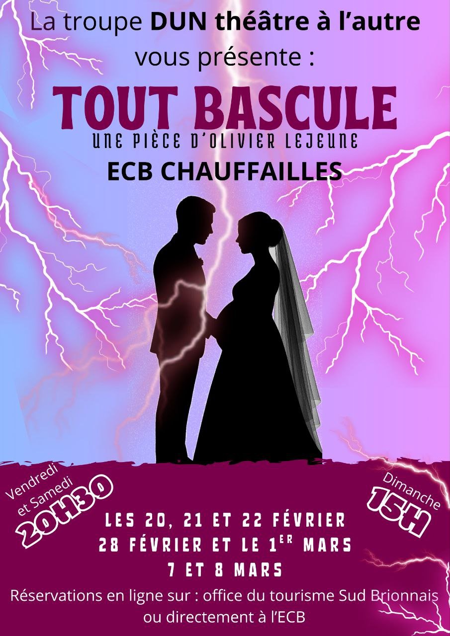 2026-02-20 20:30:00 2026-03-08 15:00:00 Europe/Paris "Tout bascule" par la troupe Dun Théâtre à l'Autre Reservations on : https://www.billetweb.fr/tout-bascule-par-la-troupe-dun-theatre-a-lautre --    Pour sa saison 2026, La Troupe Dun Théâtre à l’autre a l’immense plaisir de vous interpréter "Tout Bascule" une comédie d'Olivier Lejeune.   Qu'est-ce qui peut bien pousser un homme à divorcer deux heures après s'être marié ?  Une pièce décalée, rythmée et furieusement drôle. Un déferlement de rebondissements et de quiproquos ahurissants, des répliques percutantes, tels sont les ingrédients de cette comédie d'un ton résolument moderne où sept personnages se déchainent à un rythme d'enfer.   Dernier Week end au profit de l'association "Les Colibris" EHPAD de Coublanc (participation sur les entrées + buvette).   Espace Culturel du Brionnais, Rue Gambetta, Chauffailles, France Office de Tourisme Intercommunal Brionnais Sud Bourgogne