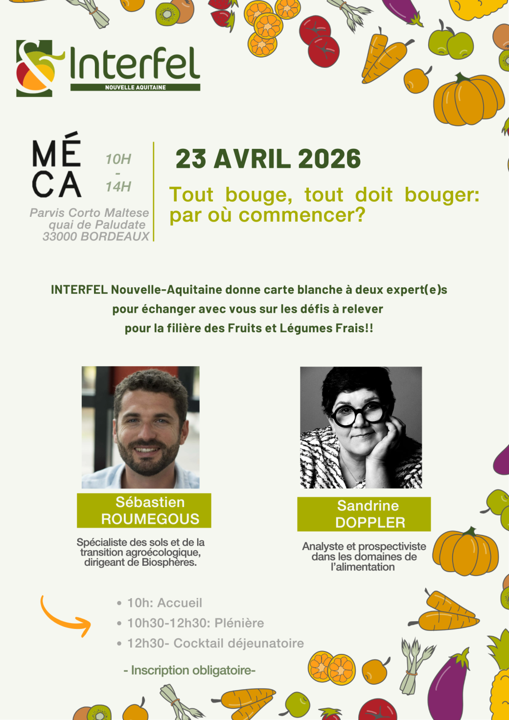 Sandrine DOPPLER (analyste et prospectiviste dans les domaines de l’alimentation) et Sébastien ROUMEGOUS (spécialiste des sols et de la transition agroécologique) partageront avec vous leur vision personnelle des évolutions des systèmes alimentaires, de la production à la consommation.