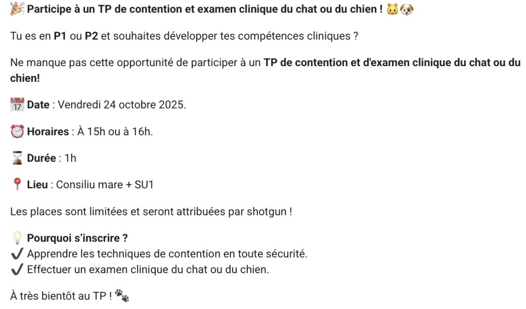 2025-10-24 15:00:002025-10-24 17:00:00Europe/BucharestTP contention et examen clinique du chien et du chatReservations on : https://www.billetweb.fr/tp-contention-et-examen-clinique-du-chien-et-du-chat