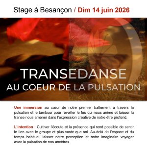 L’intention : Cultiver l’écoute et la présence qui rend possible de sentir le lien avec le groupe et plus vaste que soi. Au delà de l’espace et du temps habituel, laisser notre perception et notre imaginaire voyager avec la pulsation de nos ancêtres.