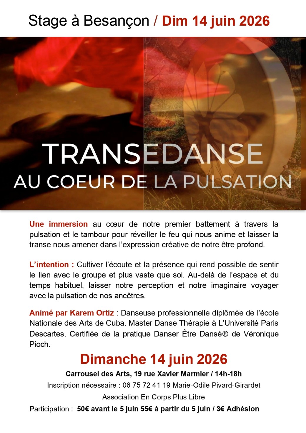 Animé par Karem Ortiz : Danseuse professionnelle diplômée de l’école Nationale des Arts de Cuba. Master Danse Thérapie à L’Université Paris Descartes. Certifiée de la pratique Danser Être DanséⓇ de Véronique Pioch.