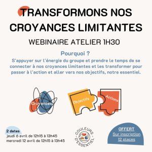 2023-04-06 12:15:00 2023-04-12 13:45:00 Europe/Paris Transformons nos croyances limitantes Reservations on : https://www.billetweb.fr/transformer-croyances --   S'appuyer sur l'énergie du groupe et prendre le temps de se connecter à nos croyances limitantes et les transformer pour passer à l'action et aller vers nos objectifs, notre essentiel.     - Couleurs d'Essentiel