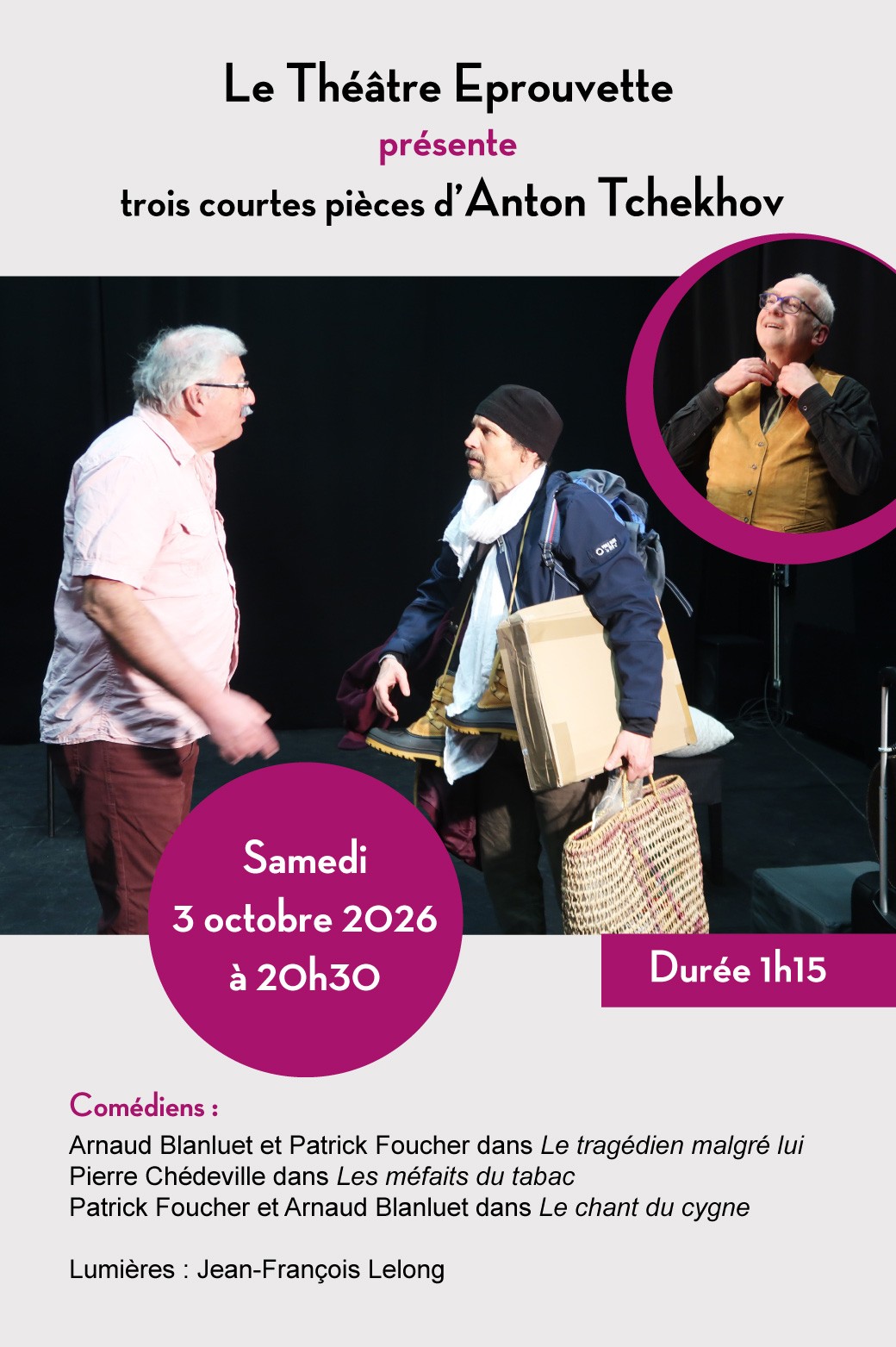 À partir du lever de rideau, la représentation dure 1h15 sans entracte.