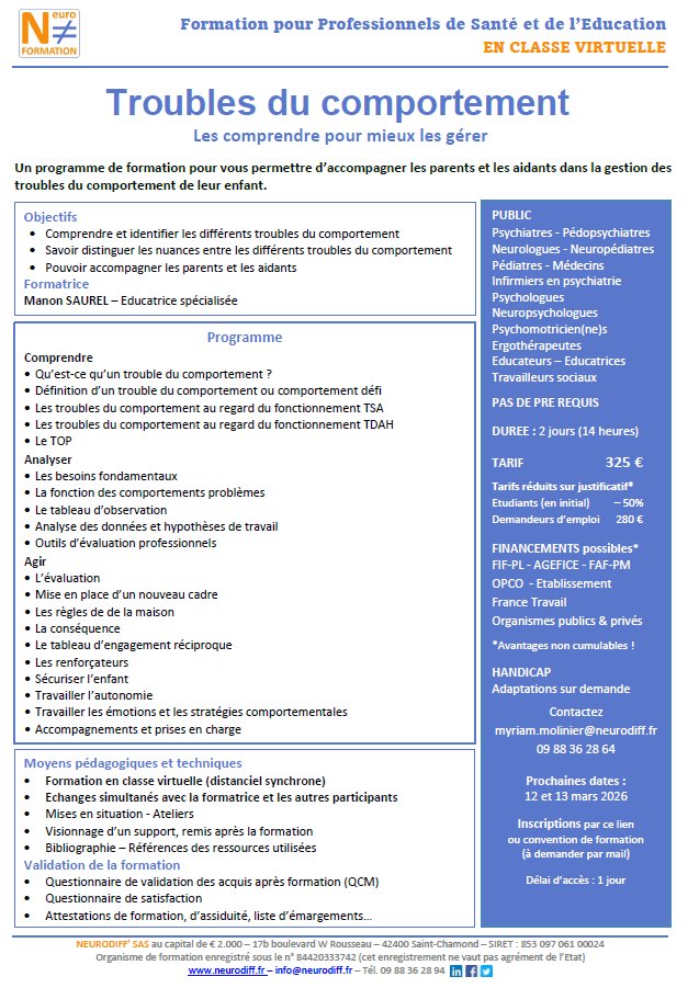 2026-03-12 09:00:00 2026-03-13 17:00:00 Europe/Paris Troubles du comportement Reservations on : http://neurodiff.fr -- ​​​​​Un programme de formation pour vous permettre d'accompagner les parents et les aidants dans la gestion des troubles du comportement de leur enfant.   Objectifs Comprendre et identifier les différents troubles du comportement Savoir distinguer les nuances entre les différents troubles du comportement Pouvoir accompagner les parents et les aidants Formatrice Manon SAUREL - Educatrice spécialisée Public Tout professionnel de santé et de l'éducation Psychiatres - Pédopsychiatres Neurologues - Neuropédiatres Pédiatres - Médecins Infirmiers Psychologues - Neuropsychologues Psychomotricien(ne)s Ergothérapeutes Orthophonistes Educateurs - Educatrices Travailleurs sociaux Pairs aidants   Pré-requis Pas de pré requis Programme Comprendre Qu’est-ce qu’un trouble du comportement ? Définition d’un trouble du comportement ou comportement défi Les troubles du comportement au regard du fonctionnement TSA Les troubles du comportement au regard du fonctionnement TDAH Analyser Le… En classe virtuelle NEURODIFF' Formation