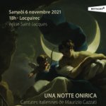 Una notte onirica est un concert dédié aux passions sacrées et profanes de l’Italie du 17e siècle. Une soprano et six instrumentistes installent une ambiance intime et parfois inquiétante grâce à des cantates et à des sonates de Maurizio Cazzati et Antonio Cesti. Les tourments d’un amant jaloux succèdent aux lumineuses antiennes à la Vierge, sinfonie et lamenti rivalisent de virtuosité. Les peurs liées aux ténèbres de la Nuit s’effacent devant l’Aurore grâce à la musique de Luigi Rossi.