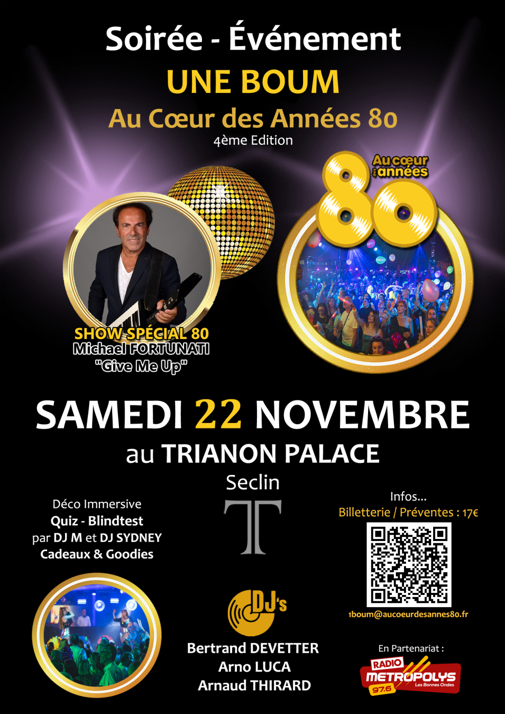 la Soirée-événement une « Boum Au Cœur des Années 80 », revient le Samedi 22 novembre 2025 dès 18h au TRIANON Palace Zone Unexpo à Seclin.