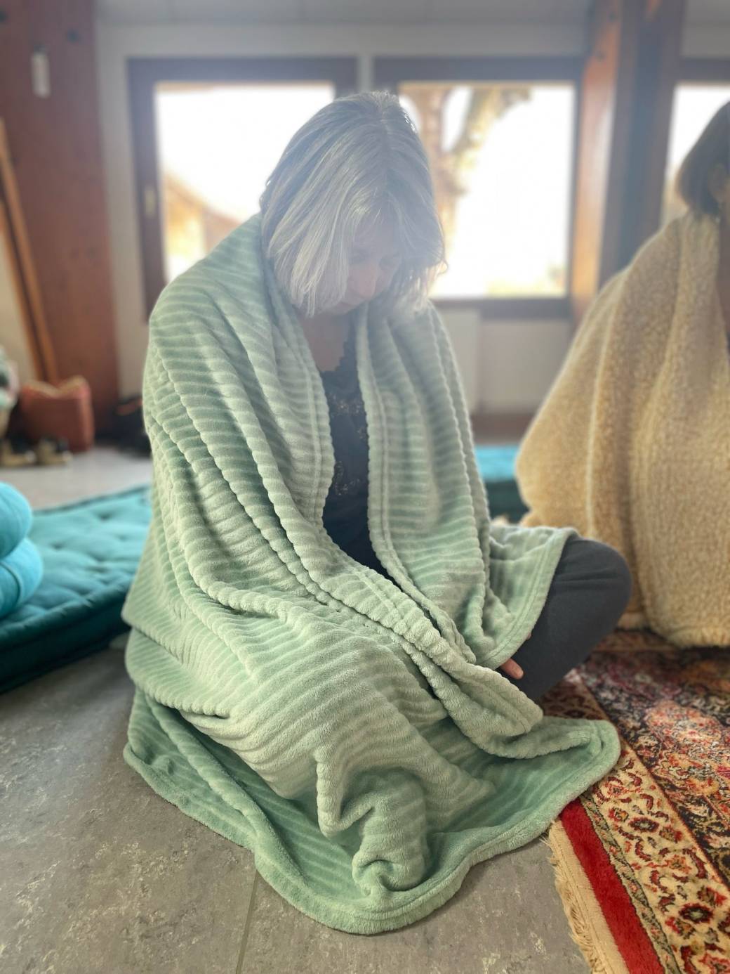 -Apportez des vêtements chauds & confortables pour bouger, un tapis de gym, un plaid, et un petit coussin ainsi qu'une bouteille d'eau