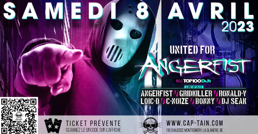 2023-04-08 22:00:00 2023-04-09 08:00:00 Europe/Brussels United For Angerfist Reservations on : https://www.billetweb.fr/united-for-angerfist1 -- SAMEDI 8 AVRIL 2023 ▶️ UNITED FOR ANGERFIST   ANGERFIST, le Dj hardcore n°1 au monde sera au CAP'TAIN pour la 1ère fois un samedi soir     LINE UP DJ’s ❌ CAP'TAIN [Room 1] ANGERFIST GRIDKILLER RONALD-V LOIC-D C-NOIZE BONNY DJ SEAK (Final Hardcore)   ❌ à L'AMIRAL [Room 2]  AKLIX  LIL STEEVE NICK LEROY   Réservez dès maintenant votre ticket et bénéficiez d'une remise internet exclusive. TICKET PRÉVENTE https://www.billetweb.fr/united-for-angerfist1 ou Scannez le QR CODE sur l'affiche   ⚠️ ATTENTION CLOTÛRE DES PRÉVENTES LE VENDREDI 7 AVRIL 2023 à 23h00 ! Passé ce délai, vente uniquement sur place au CAP'TAIN le SAMEDI 8 AVRIL 2023 au tarif plein. TARIF : 15€ en prévente (+ 0,50€ de frais de réservation) // 20€ sur place Accès à tout le COMPLEXE   ▬▬▬▬▬▬▬▬▬ OUVERTURE À 22.00 ÂGE MINIMUM : 16 ANS PARKING GRATUIT VESTIAIRE GRATUIT TOILETTES GRATUITES 2 ESPACES FUMEURS ▬▬▬▬▬▬▬▬▬   TOUTES LES PROCHAINES SOIRÉES ▶️ http://www.cap-tain.com/agenda SITE INTERNET ▶️ http://www.cap-tain.com/ FAC… COMPLEXE CAP'TAIN : 118 Chaussée Montgomery, 7611 La Glanerie, Belgique SA GMK
