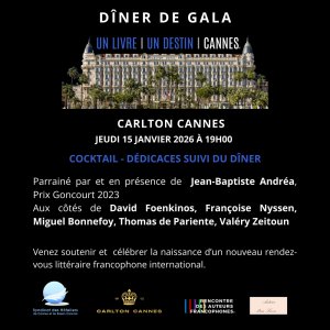 Autour de notre Parrain Fondateur Jean-Baptiste Andréa, cannois et Prix Goncourt 2023, plusieurs grands auteurs francophones et personalités culturelles, invité(e)s d’honneur de la soirée, sont déjà confirmés : Françoise Nyssen (Actes Sud, Ancienne Ministre de la Culture) - David Foenkinos (Prix Renaudot, Goncourt des lycéens) - Miguel Bonnefoy (Prix de l’Académie française, Femina) - Hemley Boum (Prix des 5 Continents, Prix Afrique) - Thomas de Pariente (Entrepreneur et auteur de “Uncommon Cannes”) - Valéry Zeitoun (Créateur/Producteur).